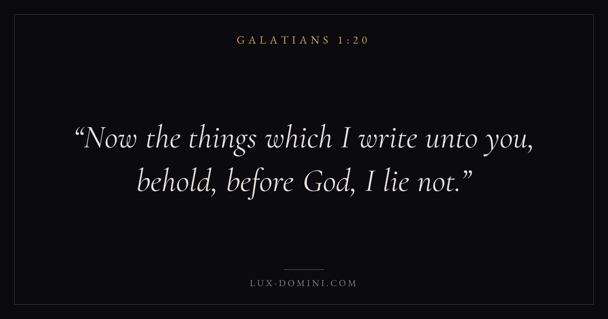 Books / Galatians / Chapter 1 / Verse 20 ← Galatians 1:19 Galatians 1:20 Galatians 1:21 → Now the things which I write unto you, behold, before God, I lie not. Download verse card Share on Twitter Share on Facebook Pin it ✦ Key themes FaithHopeWisdomGraceJustification Read with Galatians 1:21Galatians 1:22Hebrews 11:1Romans 10:17 Related topics Bible verses about faithBible verses about hopeBible verses about wisdomBible verses about grace ✦ Galatians Chapter 1 verses V. 1 V. 2 V. 3 V. 4 V. 5 V. 6 V. 7 V. 8 V. 9 V. 10 V. 11 V. 12 V. 13 V. 14 V. 15 V. 16 V. 17 V. 18 V. 19 V. 20 V. 21 V. 22 V. 23 V. 24