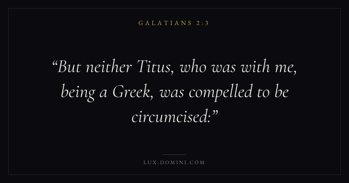 Books / Galatians / Chapter 2 / Verse 3 ← Galatians 2:2 Galatians 2:3 Galatians 2:4 → But neither Titus, who was with me, being a Greek, was compelled to be circumcised: Download verse card Share on Twitter Share on Facebook Pin it ✦ Key themes HopeAnxiety and fearPeaceGraceJustification Read with Galatians 2:1Galatians 2:2Romans 8:24Revelation 21:4 Related topics Bible verses about hopeBible verses about anxiety and fearBible verses about peaceBible verses about grace ✦ Galatians Chapter 2 verses V. 1 V. 2 V. 3 V. 4 V. 5 V. 6 V. 7 V. 8 V. 9 V. 10 V. 11 V. 12 V. 13 V. 14 V. 15 V. 16 V. 17 V. 18 V. 19 V. 20 V. 21