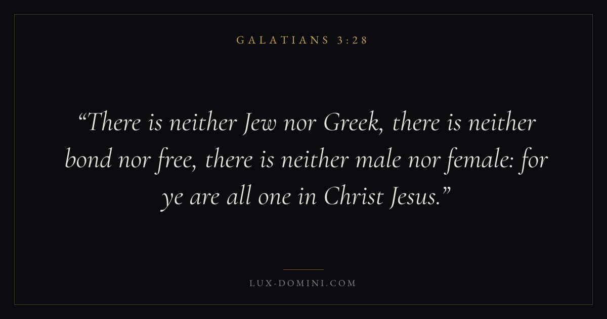There is neither Jew nor Greek, there is neither bond nor free, there is neither male nor female: for ye are all one in Christ Jesus.