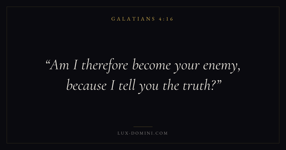 Books / Galatians / Chapter 4 / Verse 16 ← Galatians 4:15 Galatians 4:16 Galatians 4:17 → Am I therefore become your enemy, because I tell you the truth? Download verse card Share on Twitter Share on Facebook Pin it ✦ Key themes LoveHopeGraceTruthJustification Read with Galatians 4:15John 3:161 Corinthians 13:4Romans 8:24 Related topics Bible verses about loveBible verses about hopeBible verses about graceBible verses about truth ✦ Galatians Chapter 4 verses V. 1 V. 2 V. 3 V. 4 V. 5 V. 6 V. 7 V. 8 V. 9 V. 10 V. 11 V. 12 V. 13 V. 14 V. 15 V. 16 V. 17 V. 18 V. 19 V. 20 V. 21 V. 22 V. 23 V. 24 V. 25 V. 26 V. 27 V. 28 V. 29 V. 30 V. 31