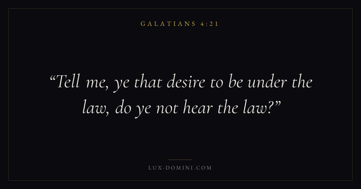 Books / Galatians / Chapter 4 / Verse 21 ← Galatians 4:20 Galatians 4:21 Galatians 4:22 → Tell me, ye that desire to be under the law, do ye not hear the law? Download verse card Share on Twitter Share on Facebook Pin it ✦ Key themes HopeGraceJustificationFreedom Read with Galatians 4:22Galatians 4:23Romans 8:24Revelation 21:4 Related topics Bible verses about hopeBible verses about grace ✦ Galatians Chapter 4 verses V. 1 V. 2 V. 3 V. 4 V. 5 V. 6 V. 7 V. 8 V. 9 V. 10 V. 11 V. 12 V. 13 V. 14 V. 15 V. 16 V. 17 V. 18 V. 19 V. 20 V. 21 V. 22 V. 23 V. 24 V. 25 V. 26 V. 27 V. 28 V. 29 V. 30 V. 31