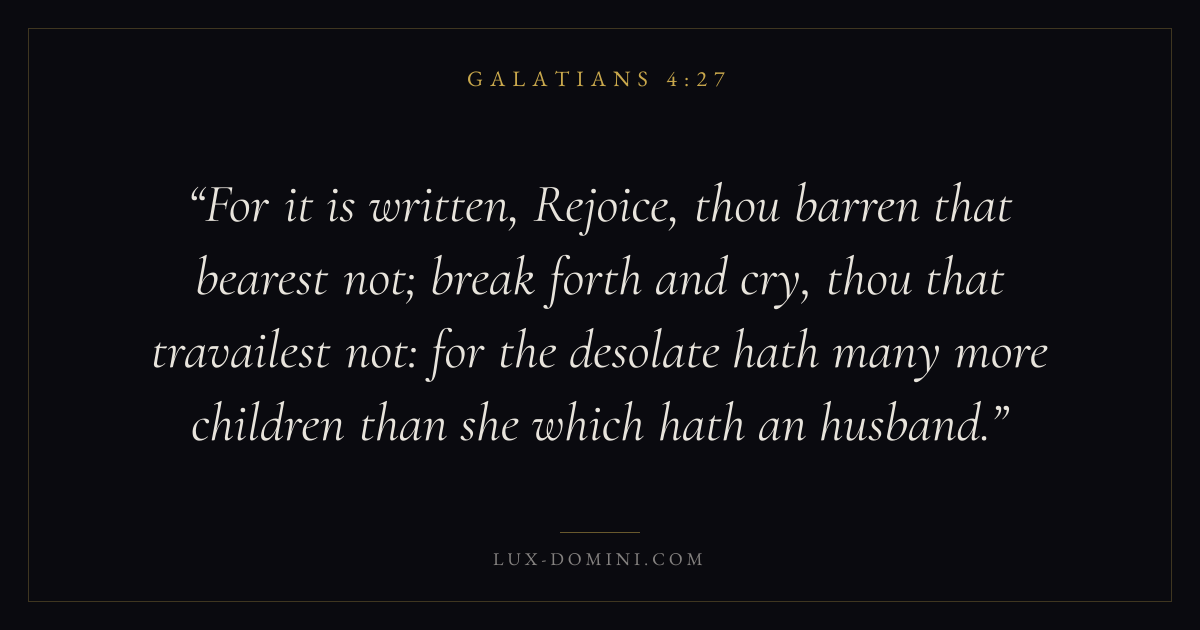 For it is written, Rejoice, thou barren that bearest not; break forth and cry, thou that travailest not: for the desolate hath many more children than she which hath an husband.