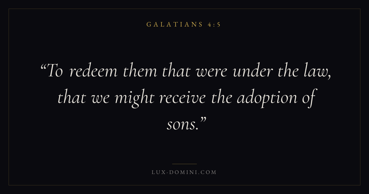 Books / Galatians / Chapter 4 / Verse 5 ← Galatians 4:4 Galatians 4:5 Galatians 4:6 → To redeem them that were under the law, that we might receive the adoption of sons. Download verse card Share on Twitter Share on Facebook Pin it ✦ Key themes HopeSalvationGraceJustification Read with Galatians 4:3Galatians 4:4Romans 8:24Revelation 21:4 Related topics Bible verses about hopeBible verses about salvationBible verses about grace ✦ Galatians Chapter 4 verses V. 1 V. 2 V. 3 V. 4 V. 5 V. 6 V. 7 V. 8 V. 9 V. 10 V. 11 V. 12 V. 13 V. 14 V. 15 V. 16 V. 17 V. 18 V. 19 V. 20 V. 21 V. 22 V. 23 V. 24 V. 25 V. 26 V. 27 V. 28 V. 29 V. 30 V. 31