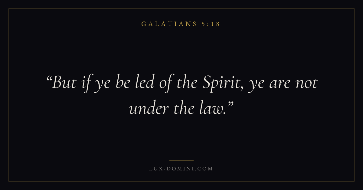 Books / Galatians / Chapter 5 / Verse 18 ← Galatians 5:17 Galatians 5:18 Galatians 5:19 → But if ye be led of the Spirit, ye are not under the law. Download verse card Share on Twitter Share on Facebook Pin it ✦ Key themes HopeGraceJustificationFreedom Read with Galatians 5:16Galatians 5:17Romans 8:24Revelation 21:4 Related topics Bible verses about hopeBible verses about grace ✦ Galatians Chapter 5 verses V. 1 V. 2 V. 3 V. 4 V. 5 V. 6 V. 7 V. 8 V. 9 V. 10 V. 11 V. 12 V. 13 V. 14 V. 15 V. 16 V. 17 V. 18 V. 19 V. 20 V. 21 V. 22 V. 23 V. 24 V. 25 V. 26