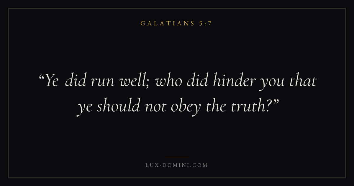 Books / Galatians / Chapter 5 / Verse 7 ← Galatians 5:6 Galatians 5:7 Galatians 5:8 → Ye did run well; who did hinder you that ye should not obey the truth? Download verse card Share on Twitter Share on Facebook Pin it ✦ Key themes HopeGraceTruthJustification Read with Galatians 5:8Galatians 5:9Romans 8:24Revelation 21:4 Related topics Bible verses about hopeBible verses about graceBible verses about truth ✦ Galatians Chapter 5 verses V. 1 V. 2 V. 3 V. 4 V. 5 V. 6 V. 7 V. 8 V. 9 V. 10 V. 11 V. 12 V. 13 V. 14 V. 15 V. 16 V. 17 V. 18 V. 19 V. 20 V. 21 V. 22 V. 23 V. 24 V. 25 V. 26