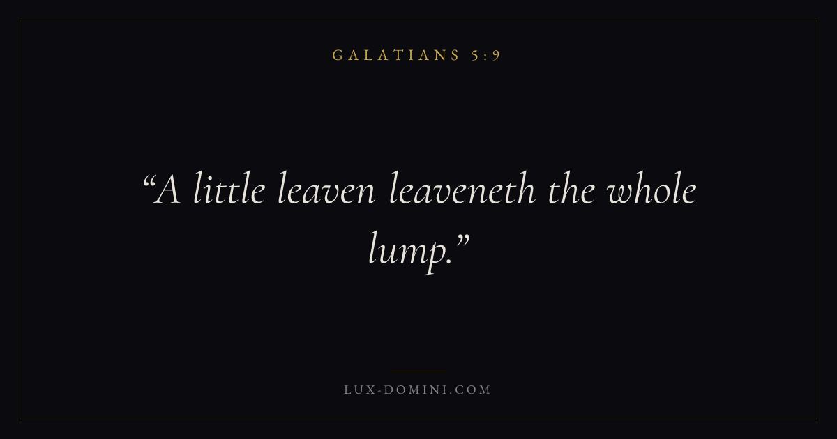Books / Galatians / Chapter 5 / Verse 9 ← Galatians 5:8 Galatians 5:9 Galatians 5:10 → A little leaven leaveneth the whole lump. Download verse card Share on Twitter Share on Facebook Pin it ✦ Key themes HopeGraceJustificationFreedom Read with Galatians 5:7Galatians 5:8Romans 8:24Revelation 21:4 Related topics Bible verses about hopeBible verses about grace ✦ Galatians Chapter 5 verses V. 1 V. 2 V. 3 V. 4 V. 5 V. 6 V. 7 V. 8 V. 9 V. 10 V. 11 V. 12 V. 13 V. 14 V. 15 V. 16 V. 17 V. 18 V. 19 V. 20 V. 21 V. 22 V. 23 V. 24 V. 25 V. 26