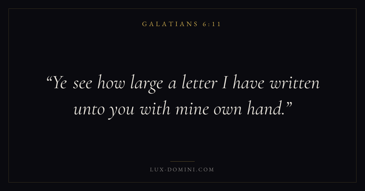 Books / Galatians / Chapter 6 / Verse 11 ← Galatians 6:10 Galatians 6:11 Galatians 6:12 → Ye see how large a letter I have written unto you with mine own hand. Download verse card Share on Twitter Share on Facebook Pin it ✦ Key themes HopeGraceJustificationFreedom Read with Galatians 6:10Romans 8:24Revelation 21:4Ephesians 2:8 Related topics Bible verses about hopeBible verses about grace ✦ Galatians Chapter 6 verses V. 1 V. 2 V. 3 V. 4 V. 5 V. 6 V. 7 V. 8 V. 9 V. 10 V. 11 V. 12 V. 13 V. 14 V. 15 V. 16 V. 17 V. 18