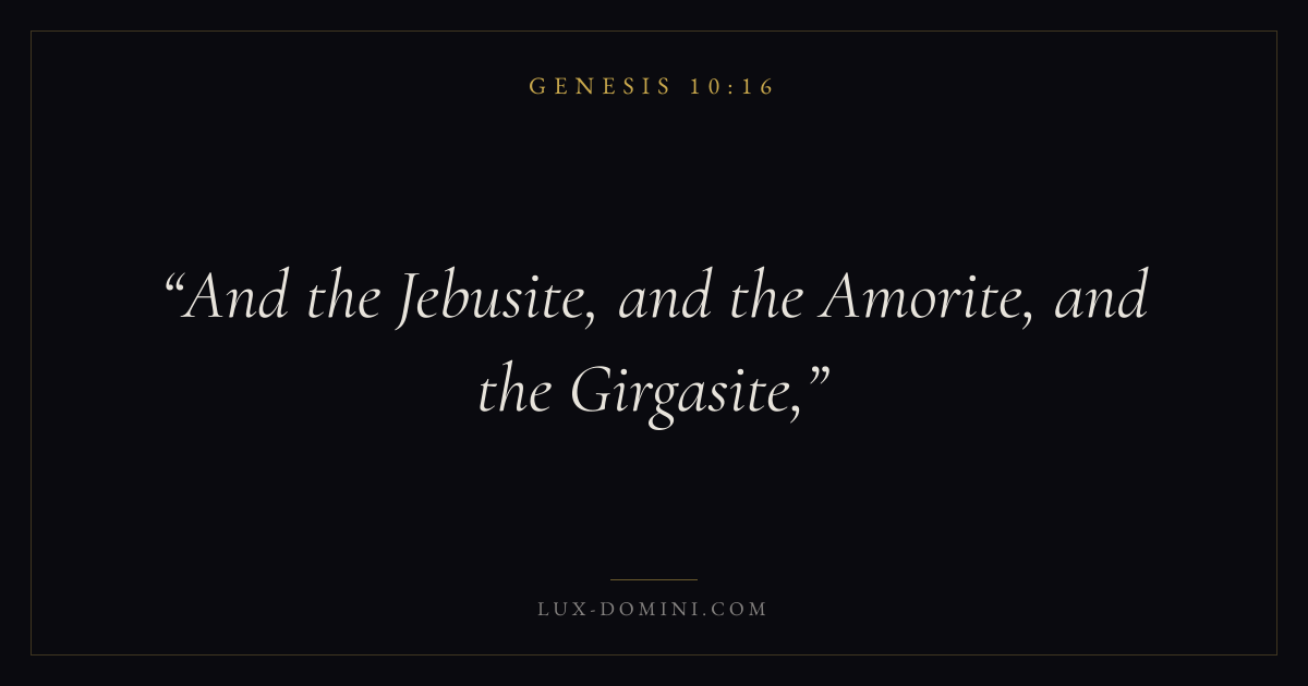 Books / Genesis / Chapter 10 / Verse 16 ← Genesis 10:15 Genesis 10:16 Genesis 10:17 → And the Jebusite, and the Amorite, and the Girgasite, Download verse card Share on Twitter Share on Facebook Pin it ✦ Key themes LoveHopeCreationFall Read with Genesis 10:15Genesis 10:17John 3:161 Corinthians 13:4 Related topics Bible verses about loveBible verses about hope ✦ Genesis Chapter 10 verses V. 1 V. 2 V. 3 V. 4 V. 5 V. 6 V. 7 V. 8 V. 9 V. 10 V. 11 V. 12 V. 13 V. 14 V. 15 V. 16 V. 17 V. 18 V. 19 V. 20 V. 21 V. 22 V. 23 V. 24 V. 25 V. 26 V. 27 V. 28 V. 29 V. 30 V. 31 V. 32