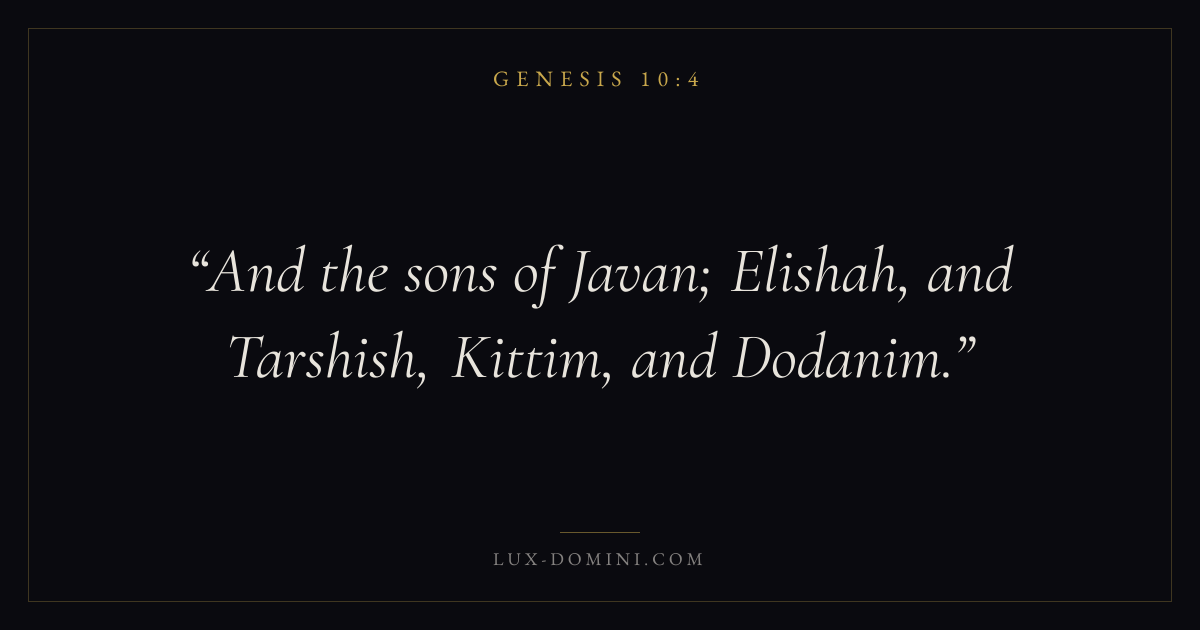 Books / Genesis / Chapter 10 / Verse 4 ← Genesis 10:3 Genesis 10:4 Genesis 10:5 → And the sons of Javan; Elishah, and Tarshish, Kittim, and Dodanim. Download verse card Share on Twitter Share on Facebook Pin it ✦ Key themes HopeCreationFallCovenant Read with Genesis 10:1Genesis 10:2Romans 8:24Revelation 21:4 Related topics Bible verses about hope ✦ Genesis Chapter 10 verses V. 1 V. 2 V. 3 V. 4 V. 5 V. 6 V. 7 V. 8 V. 9 V. 10 V. 11 V. 12 V. 13 V. 14 V. 15 V. 16 V. 17 V. 18 V. 19 V. 20 V. 21 V. 22 V. 23 V. 24 V. 25 V. 26 V. 27 V. 28 V. 29 V. 30 V. 31 V. 32