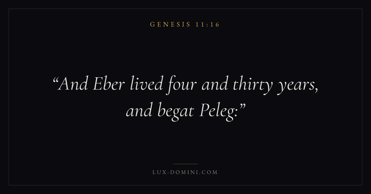Books / Genesis / Chapter 11 / Verse 16 ← Genesis 11:15 Genesis 11:16 Genesis 11:17 → And Eber lived four and thirty years, and begat Peleg: Download verse card Share on Twitter Share on Facebook Pin it ✦ Key themes HopeCreationFallCovenant Read with Genesis 11:15Genesis 11:17Romans 8:24Revelation 21:4 Related topics Bible verses about hope ✦ Genesis Chapter 11 verses V. 1 V. 2 V. 3 V. 4 V. 5 V. 6 V. 7 V. 8 V. 9 V. 10 V. 11 V. 12 V. 13 V. 14 V. 15 V. 16 V. 17 V. 18 V. 19 V. 20 V. 21 V. 22 V. 23 V. 24 V. 25 V. 26 V. 27 V. 28 V. 29 V. 30 V. 31 V. 32