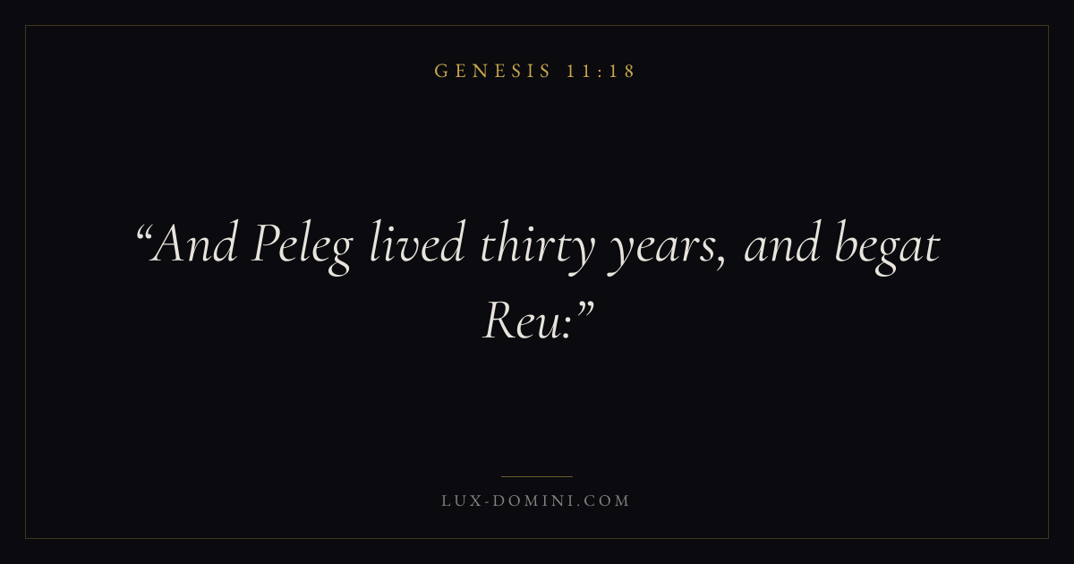 Books / Genesis / Chapter 11 / Verse 18 ← Genesis 11:17 Genesis 11:18 Genesis 11:19 → And Peleg lived thirty years, and begat Reu: Download verse card Share on Twitter Share on Facebook Pin it ✦ Key themes HopeCreationFallCovenant Read with Genesis 11:15Genesis 11:16Romans 8:24Revelation 21:4 Related topics Bible verses about hope ✦ Genesis Chapter 11 verses V. 1 V. 2 V. 3 V. 4 V. 5 V. 6 V. 7 V. 8 V. 9 V. 10 V. 11 V. 12 V. 13 V. 14 V. 15 V. 16 V. 17 V. 18 V. 19 V. 20 V. 21 V. 22 V. 23 V. 24 V. 25 V. 26 V. 27 V. 28 V. 29 V. 30 V. 31 V. 32