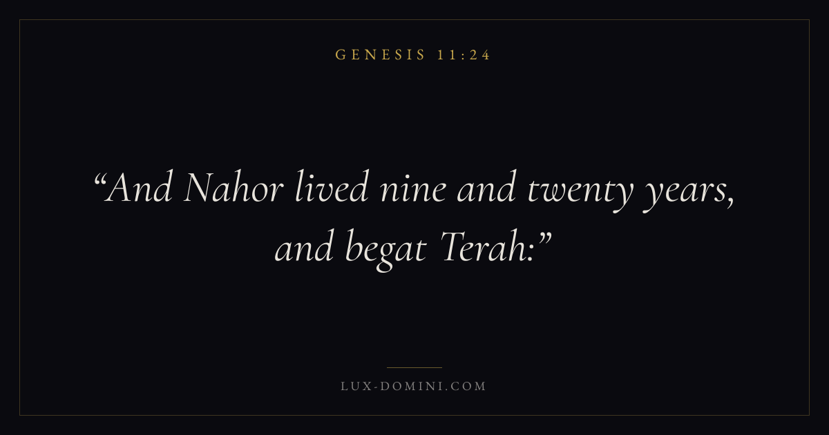 Books / Genesis / Chapter 11 / Verse 24 ← Genesis 11:23 Genesis 11:24 Genesis 11:25 → And Nahor lived nine and twenty years, and begat Terah: Download verse card Share on Twitter Share on Facebook Pin it ✦ Key themes HopeCreationFallCovenant Read with Genesis 11:20Genesis 11:21Romans 8:24Revelation 21:4 Related topics Bible verses about hope ✦ Genesis Chapter 11 verses V. 1 V. 2 V. 3 V. 4 V. 5 V. 6 V. 7 V. 8 V. 9 V. 10 V. 11 V. 12 V. 13 V. 14 V. 15 V. 16 V. 17 V. 18 V. 19 V. 20 V. 21 V. 22 V. 23 V. 24 V. 25 V. 26 V. 27 V. 28 V. 29 V. 30 V. 31 V. 32