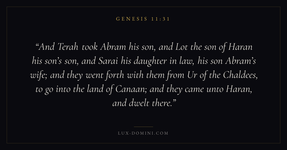And Terah took Abram his son, and Lot the son of Haran his son’s son, and Sarai his daughter in law, his son Abram’s wife; and they went forth with them from Ur of the Chaldees, to go into the land of Canaan; and they came unto Haran, and dwelt there.