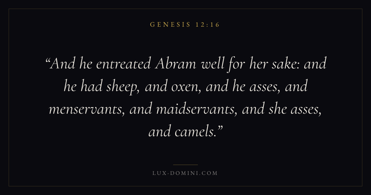 And he entreated Abram well for her sake: and he had sheep, and oxen, and he asses, and menservants, and maidservants, and she asses, and camels.