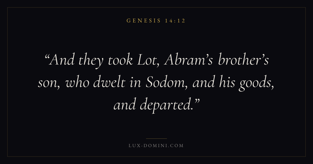 And they took Lot, Abram’s brother’s son, who dwelt in Sodom, and his goods, and departed.