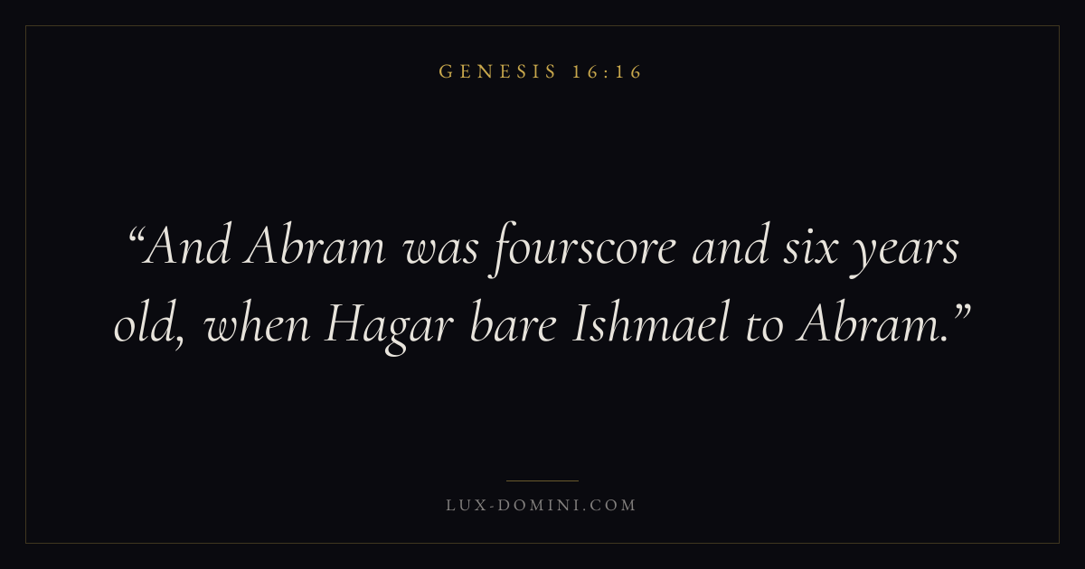 Books / Genesis / Chapter 16 / Verse 16 ← Genesis 16:15 Genesis 16:16 Genesis 17:1 → And Abram was fourscore and six years old, when Hagar bare Ishmael to Abram. Download verse card Share on Twitter Share on Facebook Pin it ✦ Key themes HopeJustice and mercyCreationFall Read with Genesis 16:15Romans 8:24Revelation 21:4Micah 6:8 Related topics Bible verses about hopeBible verses about justice and mercy ✦ Genesis Chapter 16 verses V. 1 V. 2 V. 3 V. 4 V. 5 V. 6 V. 7 V. 8 V. 9 V. 10 V. 11 V. 12 V. 13 V. 14 V. 15 V. 16