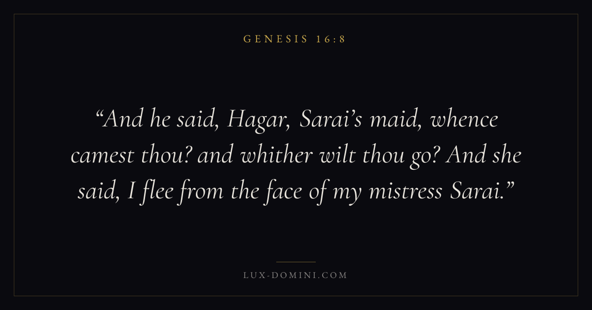 And he said, Hagar, Sarai’s maid, whence camest thou? and whither wilt thou go? And she said, I flee from the face of my mistress Sarai.