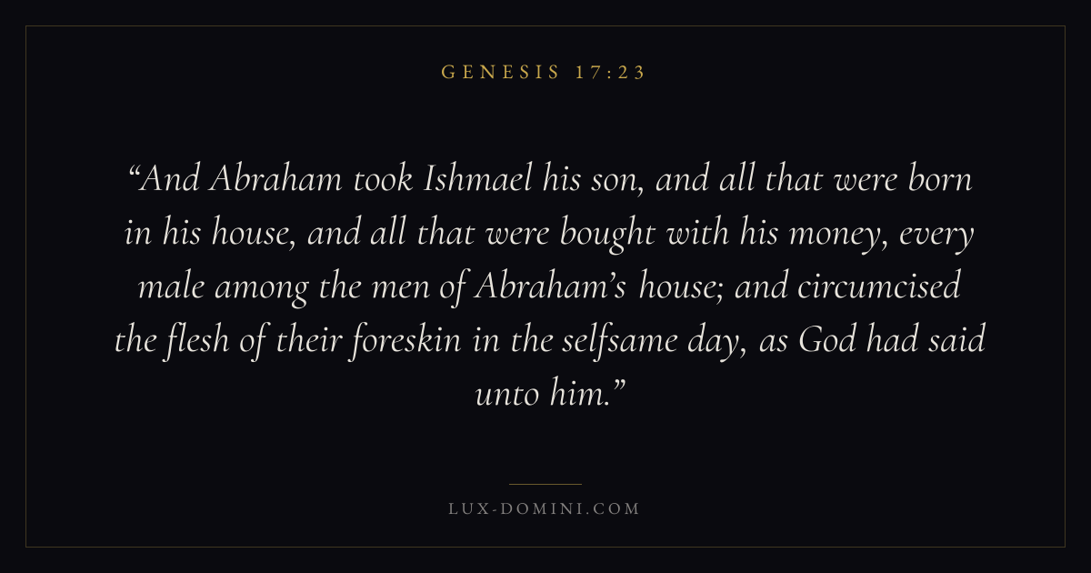 And Abraham took Ishmael his son, and all that were born in his house, and all that were bought with his money, every male among the men of Abraham’s house; and circumcised the flesh of their foreskin in the selfsame day, as God had said unto him.