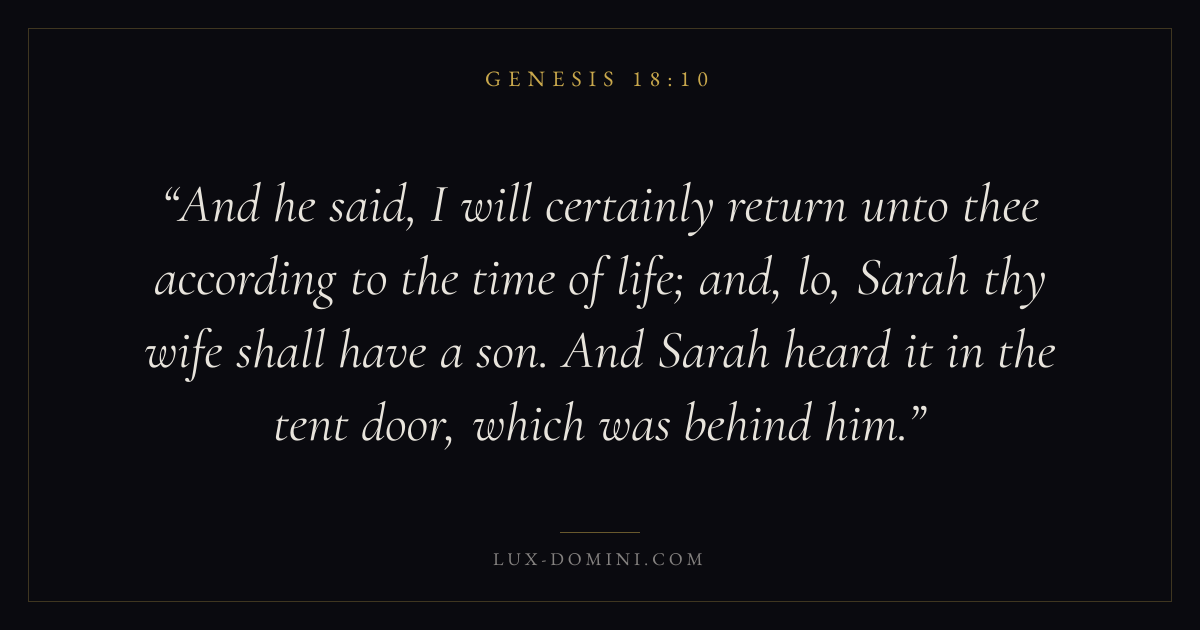 And he said, I will certainly return unto thee according to the time of life; and, lo, Sarah thy wife shall have a son. And Sarah heard it in the tent door, which was behind him.