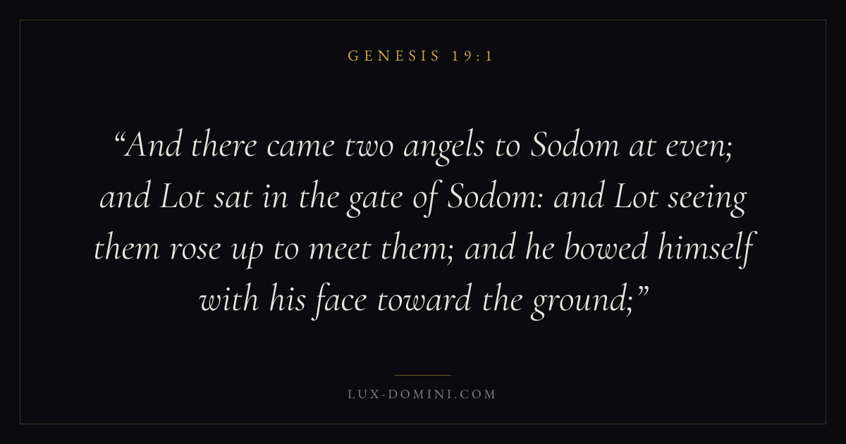 And there came two angels to Sodom at even; and Lot sat in the gate of Sodom: and Lot seeing them rose up to meet them; and he bowed himself with his face toward the ground;