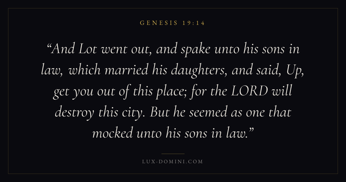 And Lot went out, and spake unto his sons in law, which married his daughters, and said, Up, get you out of this place; for the LORD will destroy this city. But he seemed as one that mocked unto his sons in law.