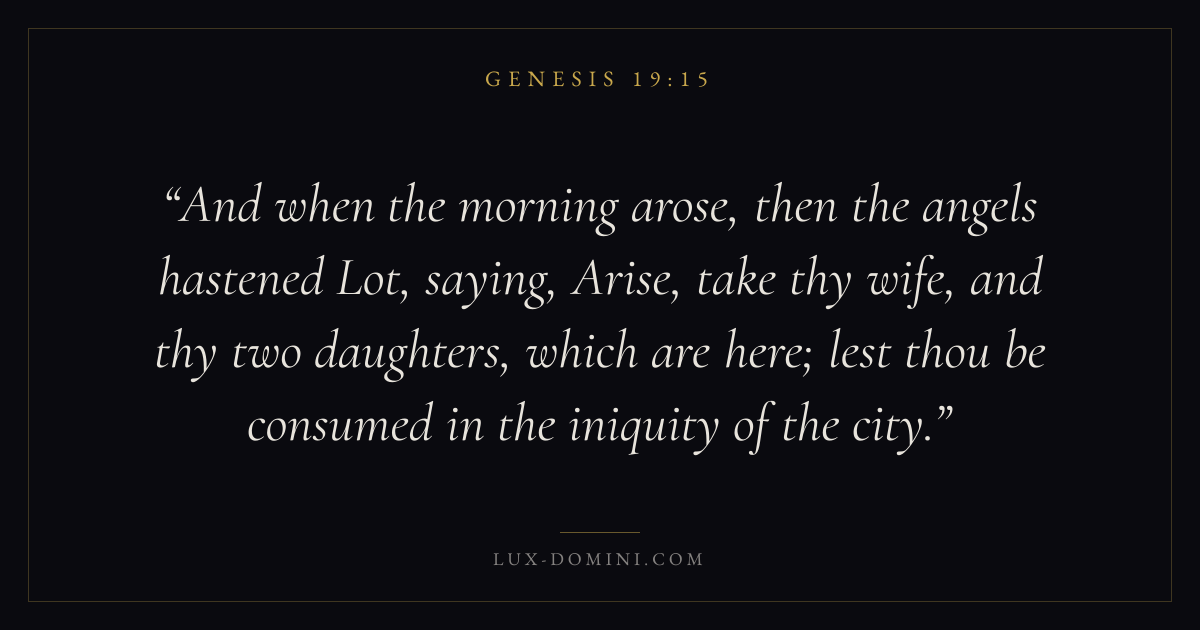 And when the morning arose, then the angels hastened Lot, saying, Arise, take thy wife, and thy two daughters, which are here; lest thou be consumed in the iniquity of the city.