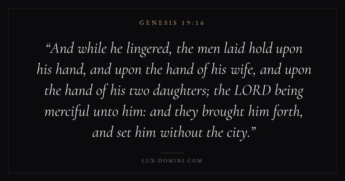 And while he lingered, the men laid hold upon his hand, and upon the hand of his wife, and upon the hand of his two daughters; the LORD being merciful unto him: and they brought him forth, and set him without the city.