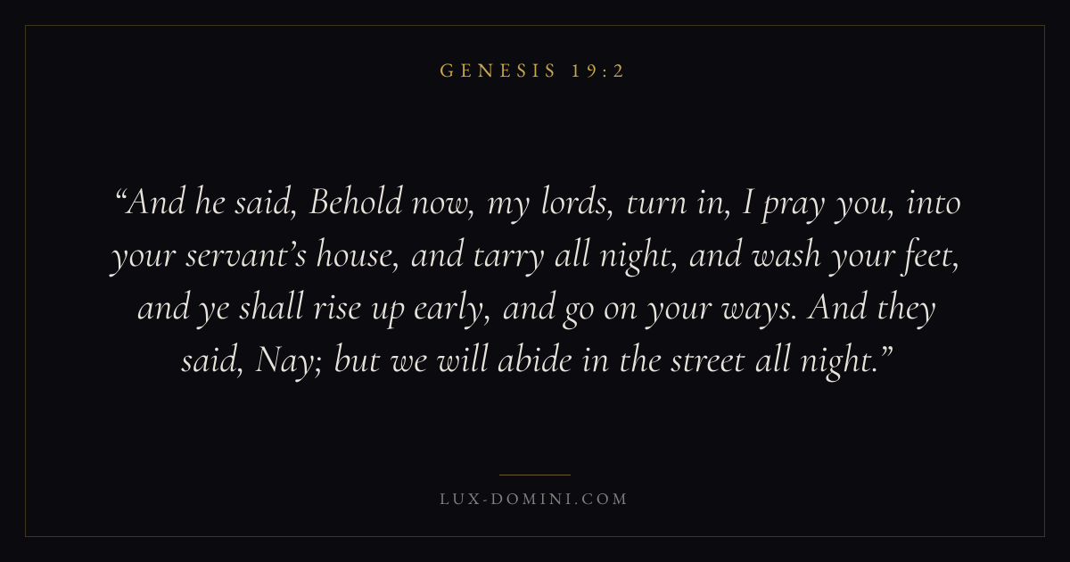 And he said, Behold now, my lords, turn in, I pray you, into your servant’s house, and tarry all night, and wash your feet, and ye shall rise up early, and go on your ways. And they said, Nay; but we will abide in the street all night.
