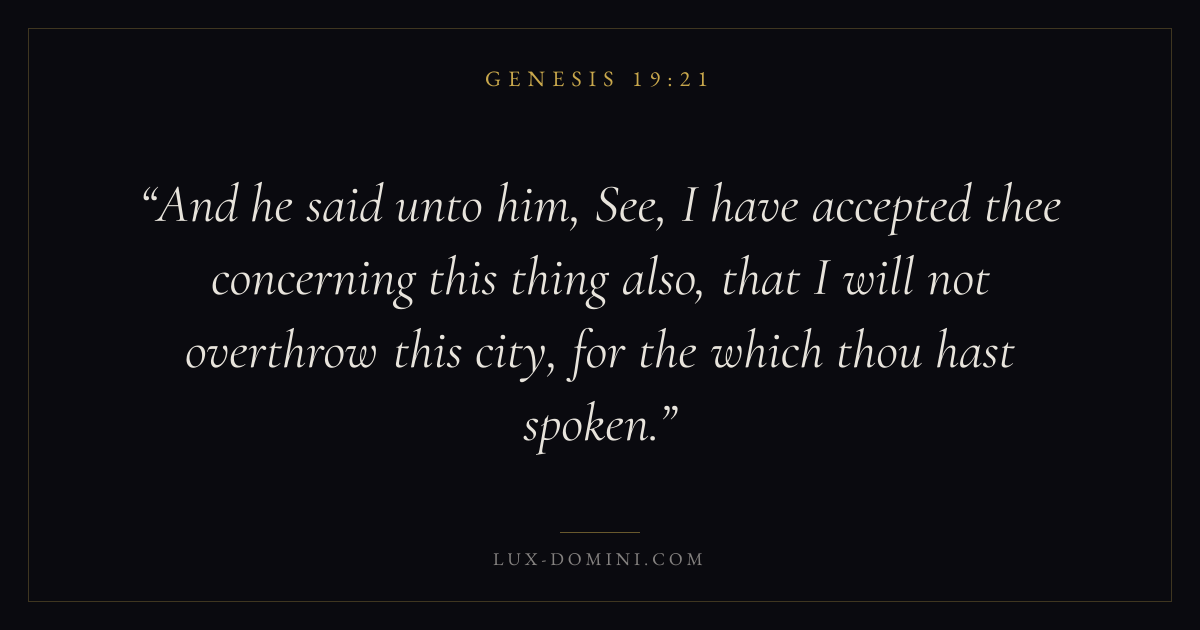 And he said unto him, See, I have accepted thee concerning this thing also, that I will not overthrow this city, for the which thou hast spoken.