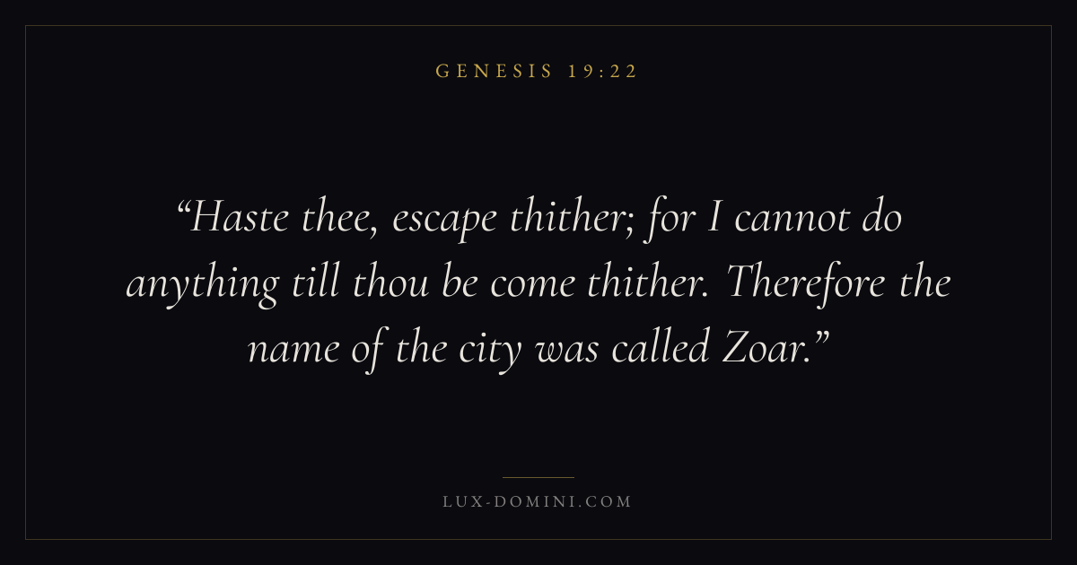 Haste thee, escape thither; for I cannot do anything till thou be come thither. Therefore the name of the city was called Zoar.