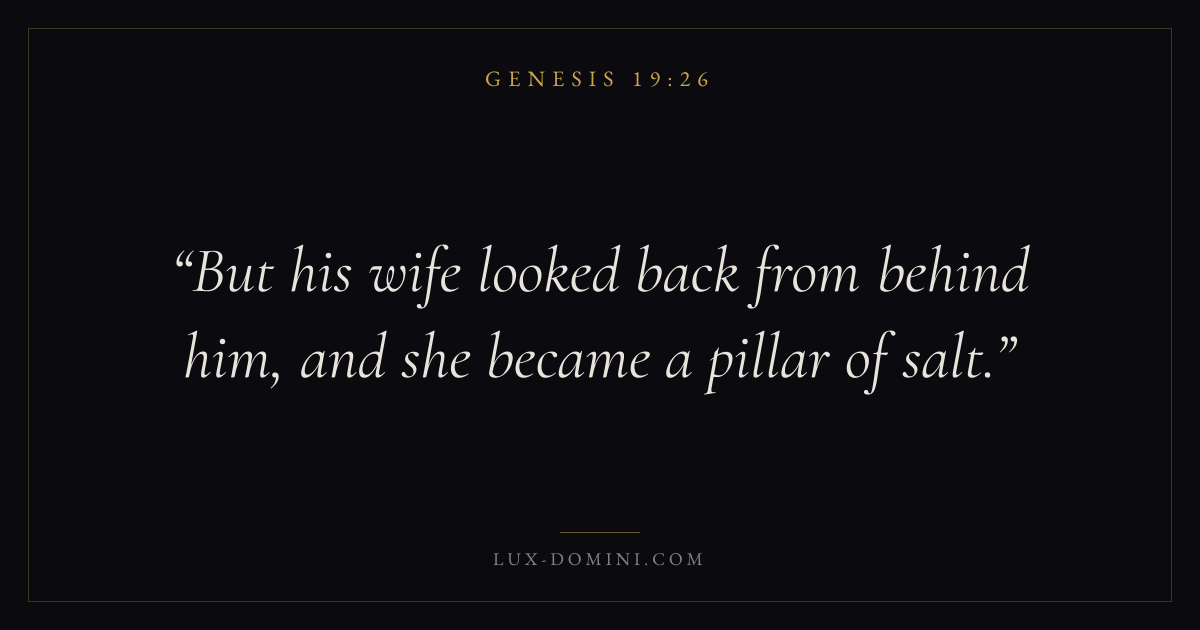 Books / Genesis / Chapter 19 / Verse 26 ← Genesis 19:25 Genesis 19:26 Genesis 19:27 → But his wife looked back from behind him, and she became a pillar of salt. Download verse card Share on Twitter Share on Facebook Pin it ✦ Key themes HopeCreationFallCovenant Read with Romans 8:24Revelation 21:4 Related topics Bible verses about hope ✦ Genesis Chapter 19 verses V. 1 V. 2 V. 3 V. 4 V. 5 V. 6 V. 7 V. 8 V. 9 V. 10 V. 11 V. 12 V. 13 V. 14 V. 15 V. 16 V. 17 V. 18 V. 19 V. 20 V. 21 V. 22 V. 23 V. 24 V. 25 V. 26 V. 27 V. 28 V. 29 V. 30 V. 31 V. 32 V. 33 V. 34 V. 35 V. 36 V. 37 V. 38