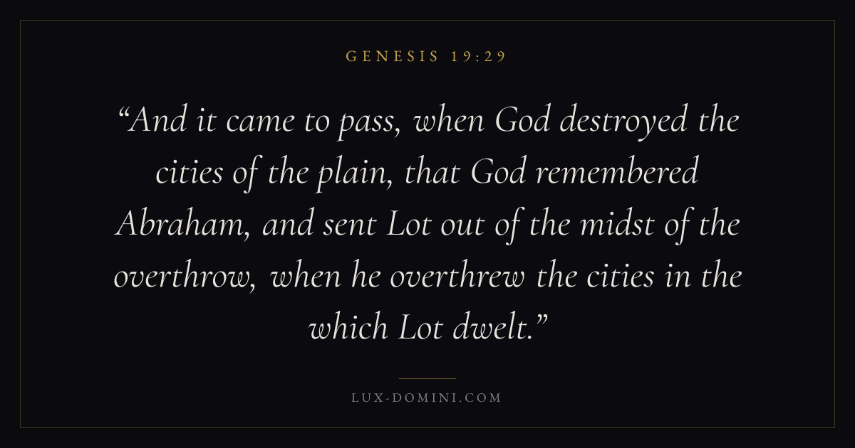 And it came to pass, when God destroyed the cities of the plain, that God remembered Abraham, and sent Lot out of the midst of the overthrow, when he overthrew the cities in the which Lot dwelt.