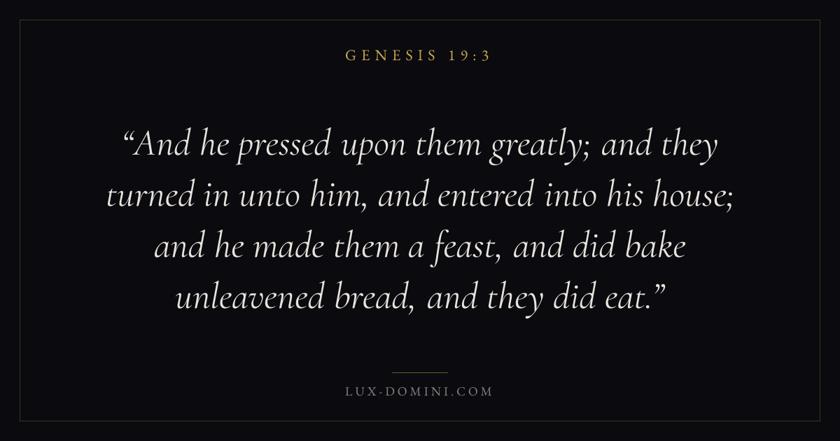 And he pressed upon them greatly; and they turned in unto him, and entered into his house; and he made them a feast, and did bake unleavened bread, and they did eat.