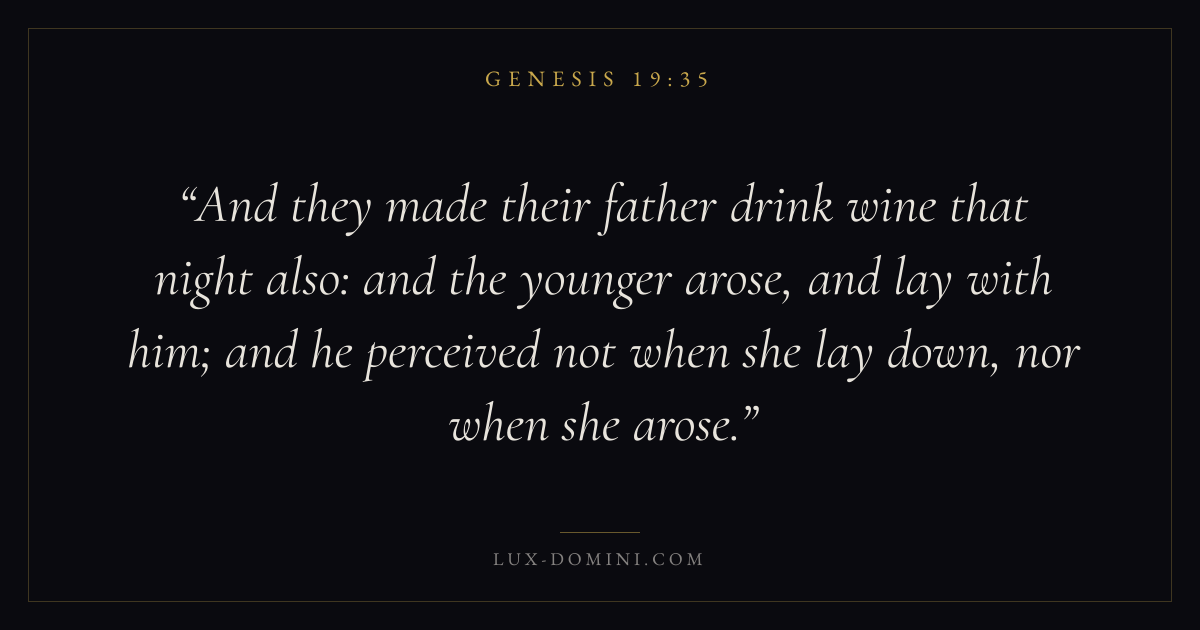 And they made their father drink wine that night also: and the younger arose, and lay with him; and he perceived not when she lay down, nor when she arose.