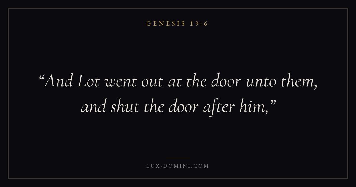 Books / Genesis / Chapter 19 / Verse 6 ← Genesis 19:5 Genesis 19:6 Genesis 19:7 → And Lot went out at the door unto them, and shut the door after him, Download verse card Share on Twitter Share on Facebook Pin it ✦ Key themes HopeCreationFallCovenant Read with Genesis 19:4Genesis 19:5Romans 8:24Revelation 21:4 Related topics Bible verses about hope ✦ Genesis Chapter 19 verses V. 1 V. 2 V. 3 V. 4 V. 5 V. 6 V. 7 V. 8 V. 9 V. 10 V. 11 V. 12 V. 13 V. 14 V. 15 V. 16 V. 17 V. 18 V. 19 V. 20 V. 21 V. 22 V. 23 V. 24 V. 25 V. 26 V. 27 V. 28 V. 29 V. 30 V. 31 V. 32 V. 33 V. 34 V. 35 V. 36 V. 37 V. 38