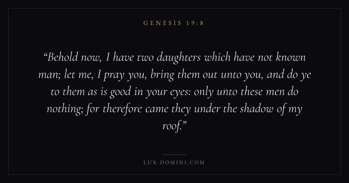 Behold now, I have two daughters which have not known man; let me, I pray you, bring them out unto you, and do ye to them as is good in your eyes: only unto these men do nothing; for therefore came they under the shadow of my roof.