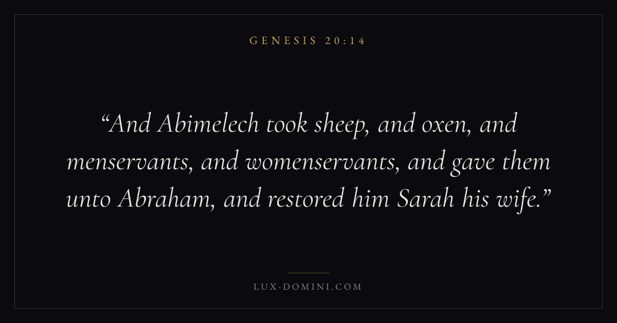 And Abimelech took sheep, and oxen, and menservants, and womenservants, and gave them unto Abraham, and restored him Sarah his wife.
