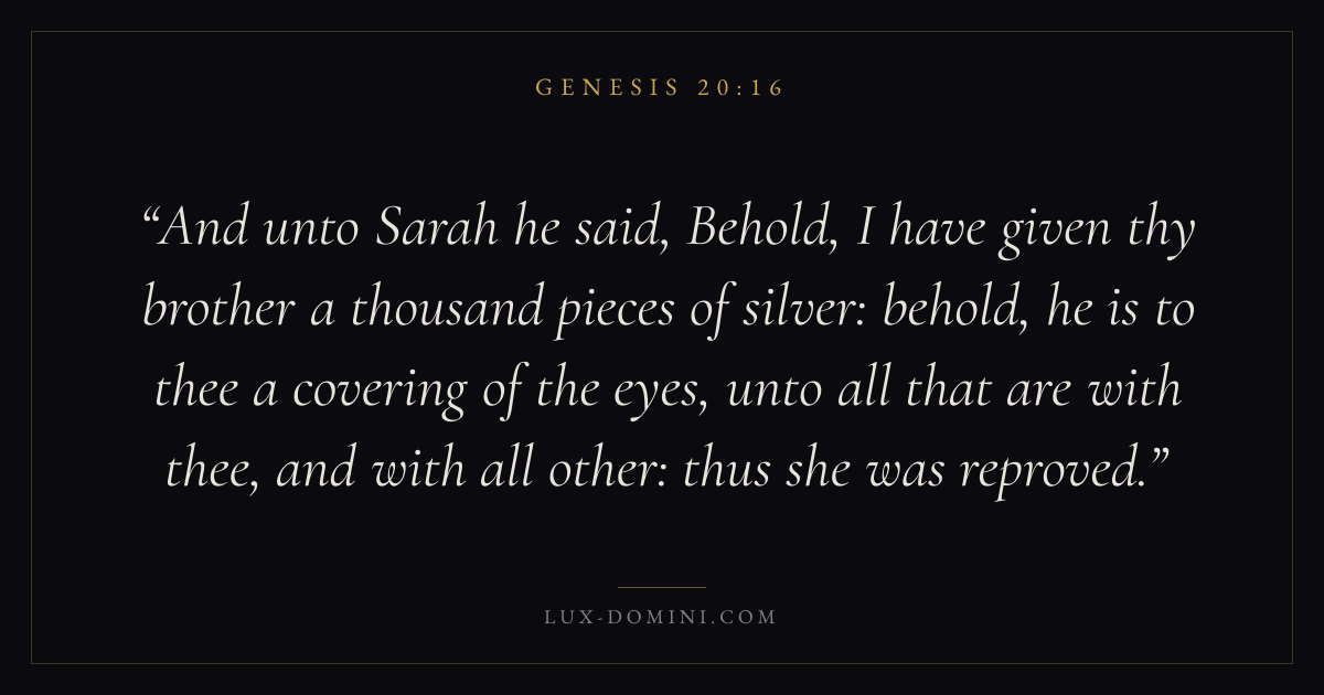 And unto Sarah he said, Behold, I have given thy brother a thousand pieces of silver: behold, he is to thee a covering of the eyes, unto all that are with thee, and with all other: thus she was reproved.