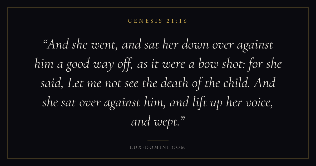 And she went, and sat her down over against him a good way off, as it were a bow shot: for she said, Let me not see the death of the child. And she sat over against him, and lift up her voice, and wept.