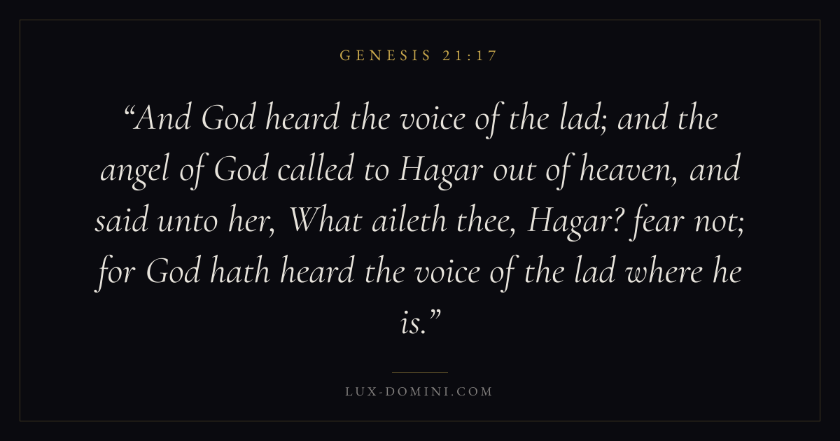 And God heard the voice of the lad; and the angel of God called to Hagar out of heaven, and said unto her, What aileth thee, Hagar? fear not; for God hath heard the voice of the lad where he is.