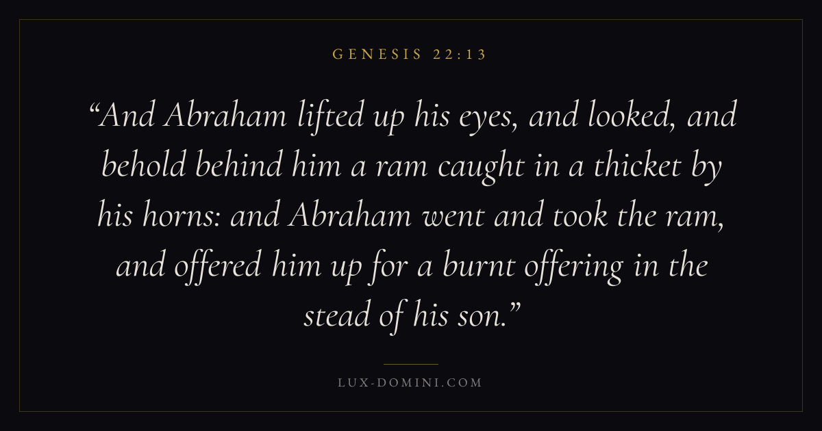 And Abraham lifted up his eyes, and looked, and behold behind him a ram caught in a thicket by his horns: and Abraham went and took the ram, and offered him up for a burnt offering in the stead of his son.