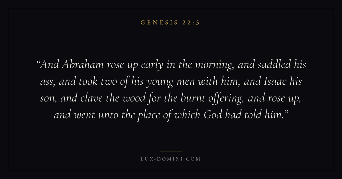 And Abraham rose up early in the morning, and saddled his ass, and took two of his young men with him, and Isaac his son, and clave the wood for the burnt offering, and rose up, and went unto the place of which God had told him.