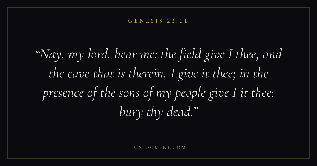 Nay, my lord, hear me: the field give I thee, and the cave that is therein, I give it thee; in the presence of the sons of my people give I it thee: bury thy dead.