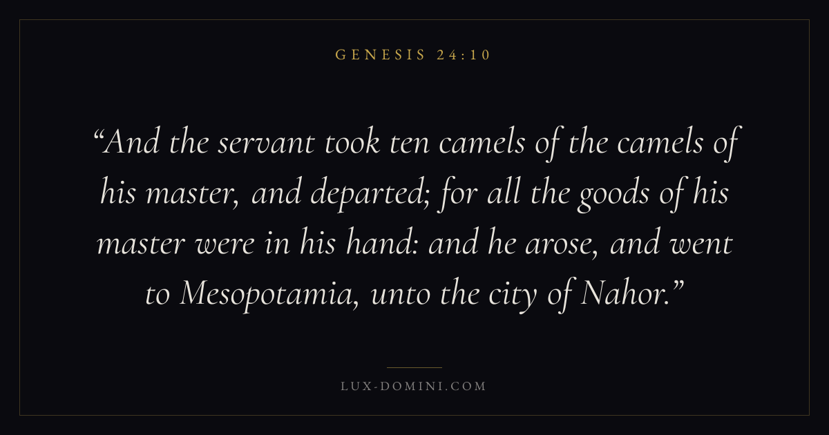 And the servant took ten camels of the camels of his master, and departed; for all the goods of his master were in his hand: and he arose, and went to Mesopotamia, unto the city of Nahor.