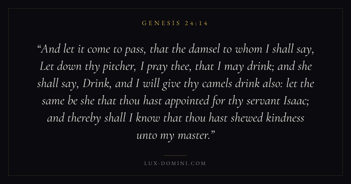 And let it come to pass, that the damsel to whom I shall say, Let down thy pitcher, I pray thee, that I may drink; and she shall say, Drink, and I will give thy camels drink also: let the same be she that thou hast appointed for thy servant Isaac; and thereby shall I know that thou hast shewed kindness unto my master.