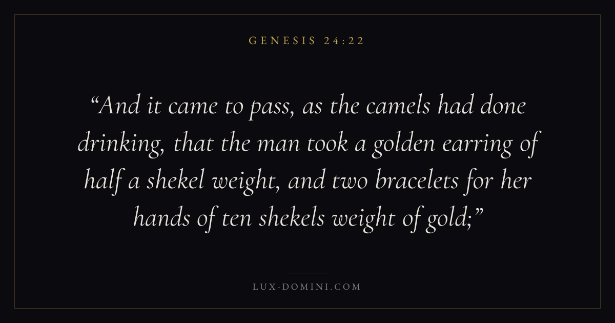 And it came to pass, as the camels had done drinking, that the man took a golden earring of half a shekel weight, and two bracelets for her hands of ten shekels weight of gold;
