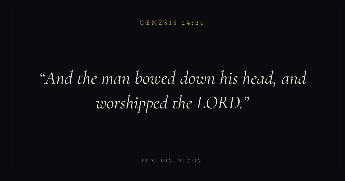 Books / Genesis / Chapter 24 / Verse 26 ← Genesis 24:25 Genesis 24:26 Genesis 24:27 → And the man bowed down his head, and worshipped the LORD. Download verse card Share on Twitter Share on Facebook Pin it ✦ Key themes HopeCreationFallCovenant Read with Genesis 24:25Genesis 24:27Romans 8:24Revelation 21:4 Related topics Bible verses about hope ✦ Genesis Chapter 24 verses V. 1 V. 2 V. 3 V. 4 V. 5 V. 6 V. 7 V. 8 V. 9 V. 10 V. 11 V. 12 V. 13 V. 14 V. 15 V. 16 V. 17 V. 18 V. 19 V. 20 V. 21 V. 22 V. 23 V. 24 V. 25 V. 26 V. 27 V. 28 V. 29 V. 30 V. 31 V. 32 V. 33 V. 34 V. 35 V. 36 V. 37 V. 38 V. 39 V. 40 V. 41 V. 42 V. 43 V. 44 V. 45 V. 46 V. 47 V. 48 V. 49 V. 50 V. 51 V. 52 V. 53 V. 54 V. 55 V. 56 V. 57 V. 58 V. 59 V. 60 V. 61 V. 62 V. 63 V. 64 V. 65 V. 66 V. 67