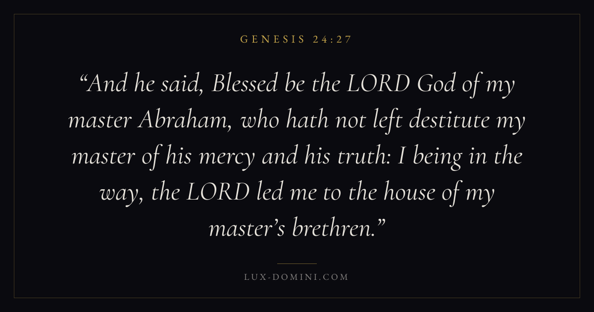 And he said, Blessed be the LORD God of my master Abraham, who hath not left destitute my master of his mercy and his truth: I being in the way, the LORD led me to the house of my master’s brethren.