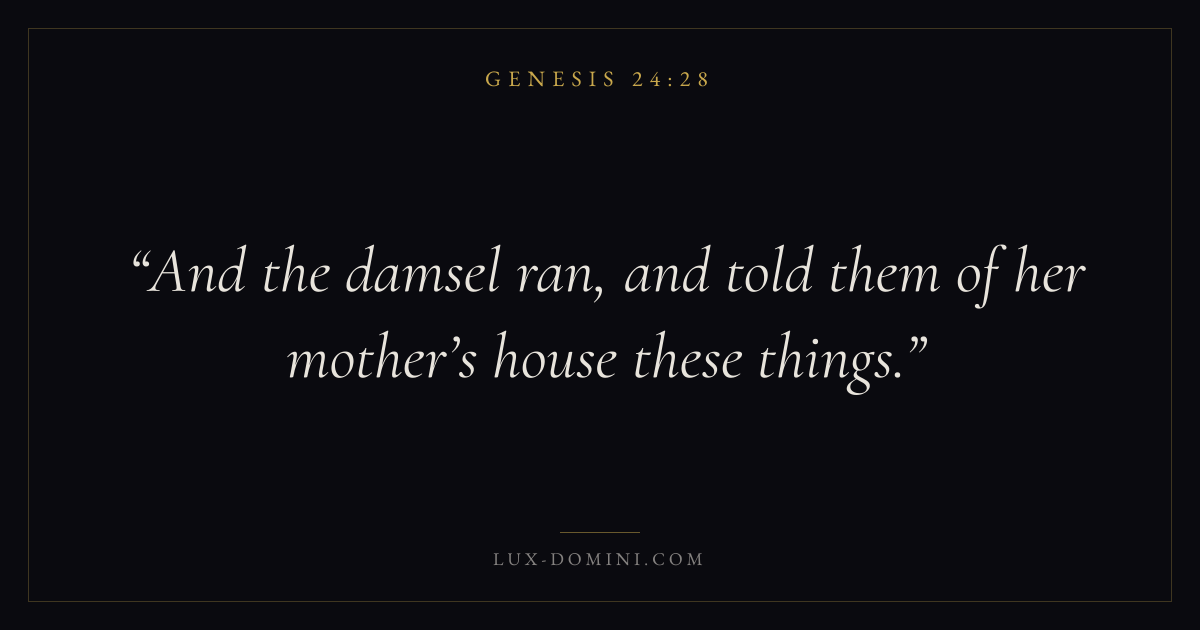 Books / Genesis / Chapter 24 / Verse 28 ← Genesis 24:27 Genesis 24:28 Genesis 24:29 → And the damsel ran, and told them of her mother’s house these things. Download verse card Share on Twitter Share on Facebook Pin it ✦ Key themes HopeCreationFallCovenant Read with Genesis 24:25Genesis 24:26Romans 8:24Revelation 21:4 Related topics Bible verses about hope ✦ Genesis Chapter 24 verses V. 1 V. 2 V. 3 V. 4 V. 5 V. 6 V. 7 V. 8 V. 9 V. 10 V. 11 V. 12 V. 13 V. 14 V. 15 V. 16 V. 17 V. 18 V. 19 V. 20 V. 21 V. 22 V. 23 V. 24 V. 25 V. 26 V. 27 V. 28 V. 29 V. 30 V. 31 V. 32 V. 33 V. 34 V. 35 V. 36 V. 37 V. 38 V. 39 V. 40 V. 41 V. 42 V. 43 V. 44 V. 45 V. 46 V. 47 V. 48 V. 49 V. 50 V. 51 V. 52 V. 53 V. 54 V. 55 V. 56 V. 57 V. 58 V. 59 V. 60 V. 61 V. 62 V. 63 V. 64 V. 65 V. 66 V. 67