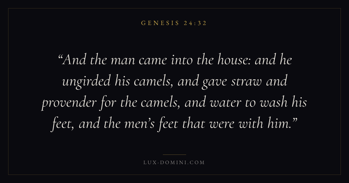 And the man came into the house: and he ungirded his camels, and gave straw and provender for the camels, and water to wash his feet, and the men’s feet that were with him.